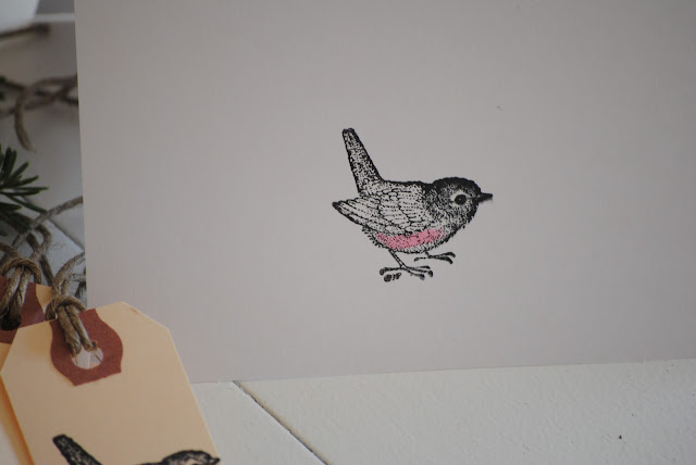 The Raz Family Christmas card is just as simple as it can get this year. No gold embossed and glittered scenes of a Winter wonderland, or a photo of us all in matching sweaters with the dog sitting at our feet. No....my card this year was a 5 minute production for all 25. A pack of blank white cardstock with envelopes from Michaels (bought way back in the summer), a robin ink stamp and a smudging of red across the robins breast. Stamp, stamp stamp.....swish, swish, swish...and I'm done. Honestly it took not more than a few minutes to do the whole pack. I also made a few gift tags while the ink was out. And if you think that I delved into my collection of watercolors to give the birds a faint blush....you would be mistaken. That crimson breast is done with my lip tint..it comes with a handy little brush for making the perfect little swoosh.